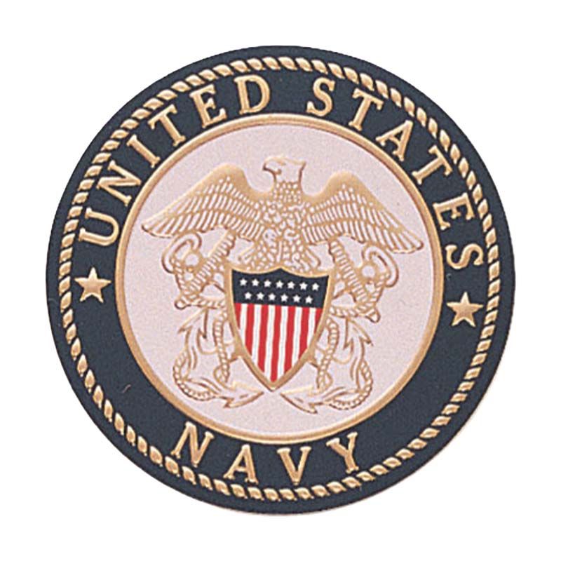 - Round United States Navy shield emblem multi-purpose metal medallion decal disc that measures 4 inches.