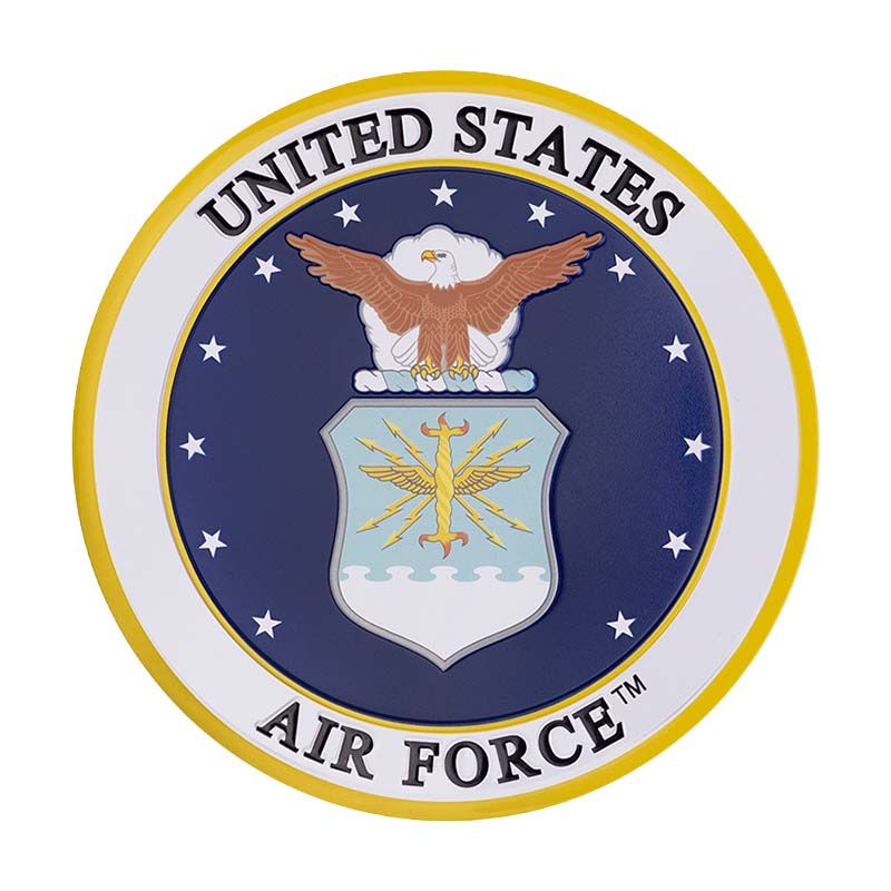 - Round United States Air Force shield emblem multi-purpose metal medallion decal disc that measures 4 inches.