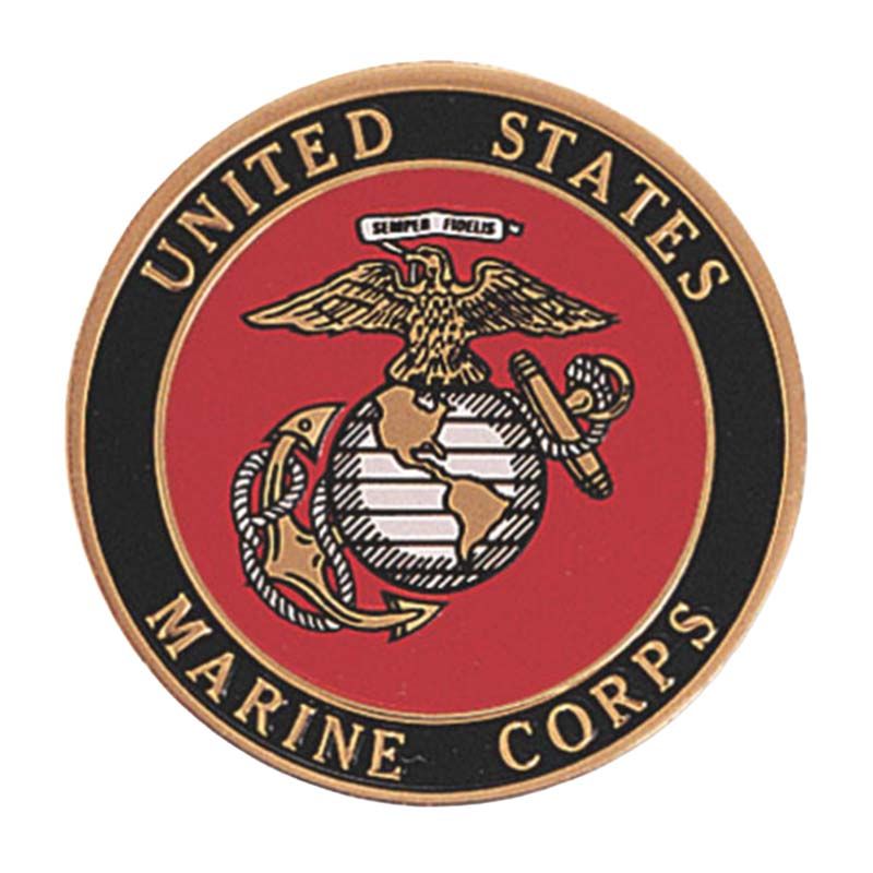 - Round United States Marine Corps shield emblem multi-purpose metal medallion decal disc that measures 4 inches.
