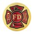 - Pictured on disc is a red Fire Department shield badge, which has the letters "FD" in the center, followed by a fire hydrant, a fire helmet, a ladder, and an axe from left to right respectively.