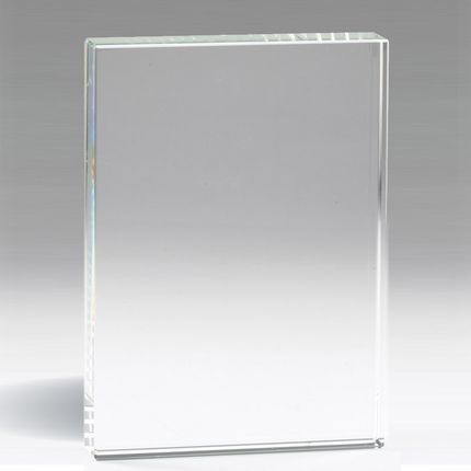 Standing rectangular optical crystal desk block. Size is 5 inch (height) x 3 inch (width) x 1 inch (thickness).