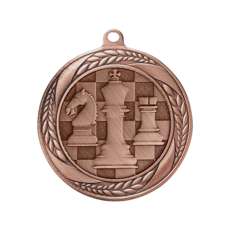 - 2-1/4 Inch Chess medal in antiqued gold, silver, or bronze finish